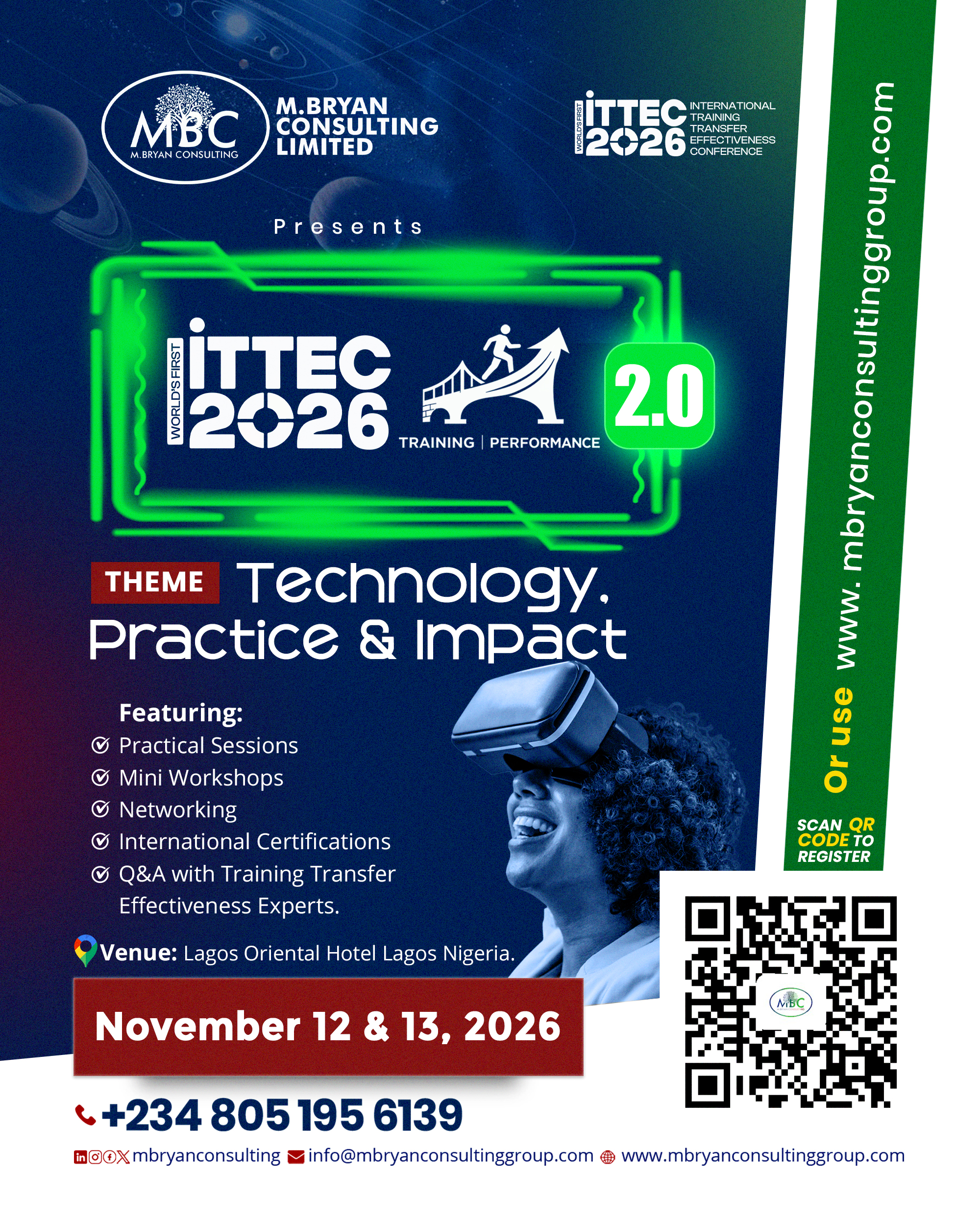Held on November 12–13, 2026, at the Lagos Oriental Hotel, Lagos, Nigeria, ITTEC 2026 will feature keynotes, expert-led sessions, practical labs, mini workshops, and real-world case studies anchored on the Training Transfer Effectiveness Operating System (TTE-OS), with deep application of the Needs Validation Process (NVP), the Pre-During-Post (PDP) Model, and technology-enabled tools for sustaining transfer and measuring impact. Participants will gain actionable insights, practical tools, and strategic clarity on how to design, support, measure, and sustain training that delivers Impact, Return on Investment (ROI), and Return on Expectation (ROE). ITTEC 2.0 is not just a conference; it is a movement shaping the future of training impact across Africa and beyond.